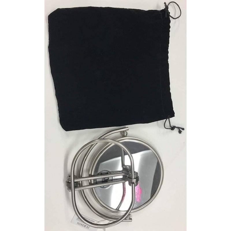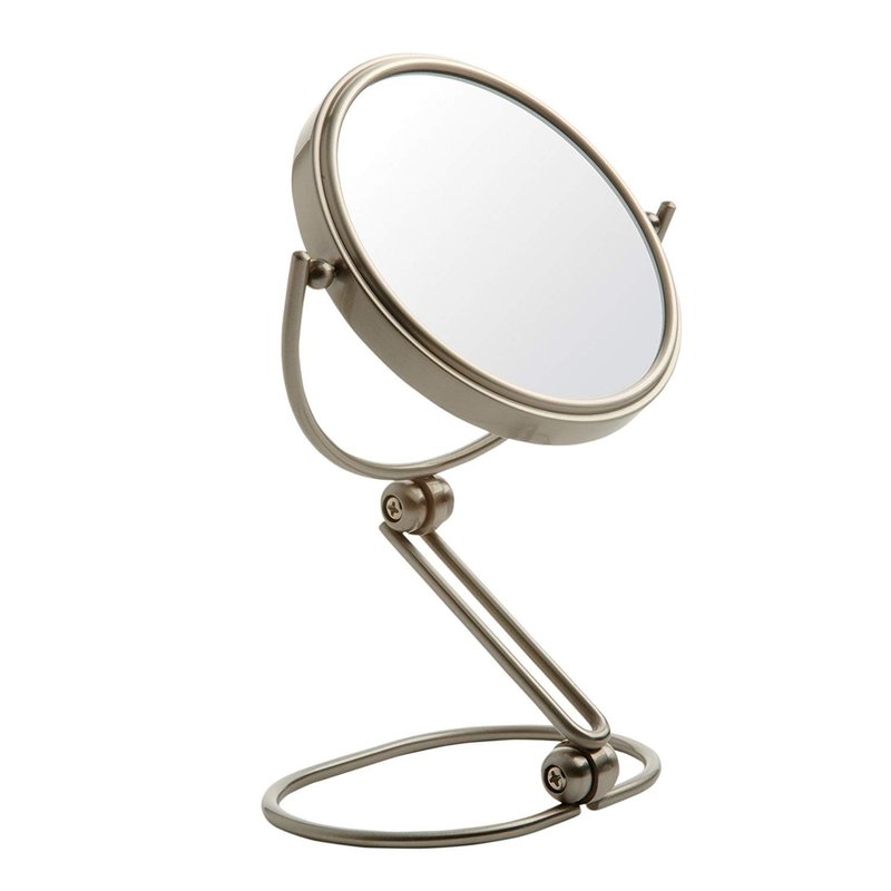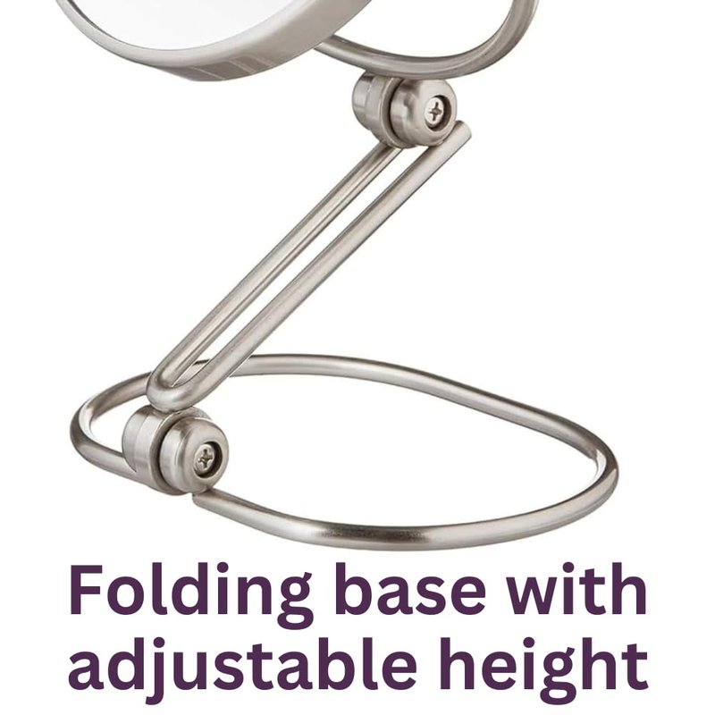 - SPECIFICATIONS - This makeup mirror includes a folding base, making it ideal for travel. The mirror has a modern, nickel finish and a 360-degree swivel function. The mirror is 6 inches in diameter and has a 1-year warranty