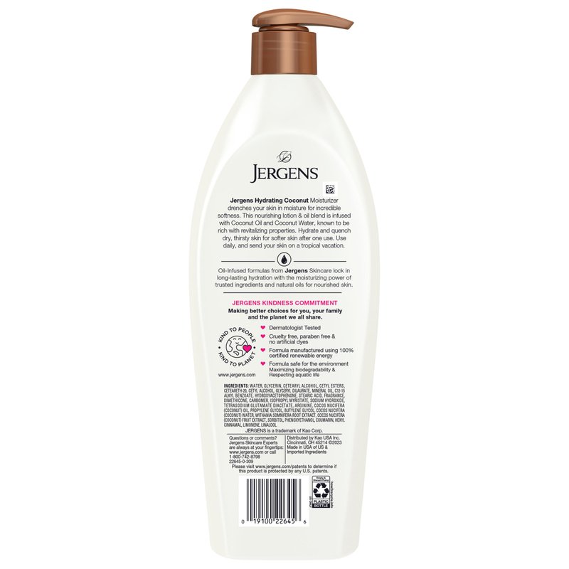 Jergens Hydrating Coconut Body Moisturizer, Infused with Coconut Oil, Dermatologist Tested, Hand and Body Lotion for Dry Skin, 26.5 Oz