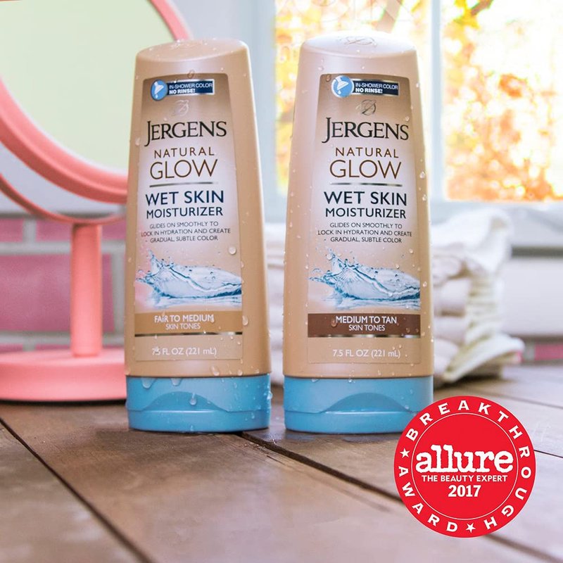 - GRADUAL SUNLESS TANNING - Jergens Natural Glow Wet Skin Moisturizer glides on smooth for in-shower application, and develops color with minimal transfer or drying time