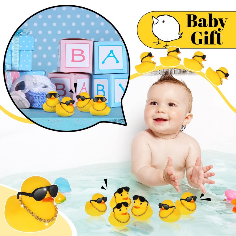 - Baby Bath Companion: cute and lively duck shape, with sunglasses and necklaces, the little rubber ducks are cool and can float on the water; When you press them, they will make funny sounds, adding fun to the bath, so very suitable for baby shower or baby playing in bathtub and swimming pool