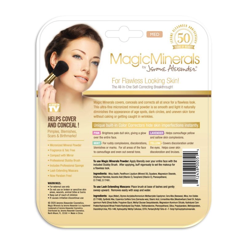 Introducing MagicMinerals by Jerome Alexander – your all-in-one flawless magic! Prepare to be amazed by this innovative mineral powder foundation that conceals, corrects, and grants up to 12 hours of natural, matte coverage for a radiant look that lasts all day. Say farewell to blemishes, spots, and fine lines, as MagicMinerals brings out your beauty effortlessly! The secret lies in the self-adjusting technology – ultra-fine micronized mineral powder that adapts to your unique skin tone. No more makeup mishaps! Achieve a smooth, even look with ease using the included Professional Stubby foundation powder brush and blending sponge – no creases, no streaks! MagicMinerals makeup powder foundation cares for your skin's well-being – paraben, talc, and fragrance-FREE, suitable for even sensitive skin. Enriched with antioxidants, Vitamin E, and Vitamin C, it nourishes and protects while providing a natural SPF for radiant, healthy-looking skin. But there's more! Our Lash Extending Mascara is your go-to for dramatic, clump-free lashes that curl and volumize with each stroke. No heaviness, just pure lash perfection! Beauty on the go is made easy with the compact design and mirror for quick touch-ups wherever you are. Effortless beauty is just a brush away with our loose powder foundation! Join the revolution and experience makeup that genuinely cares for your skin. Jerome Alexander's passion for empowering women shines through every product. Embrace your flawless magic and let your natural beauty shine – gorgeous, glowing skin awaits you!