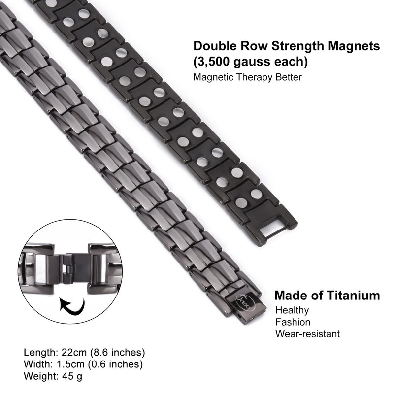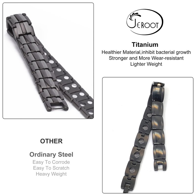 - ☑️ PREMIUM PURE TITANIUM MATERIAL – Titanium is undoubtedly the better daily metal, it is healthier, will not irritate the skin, compared to stainless steel it is lighter, harder texture, and more wear-resistant.This premium JEROOT magnetic bracelet is made of pure titanium, you do not need to worry about any quality issues.