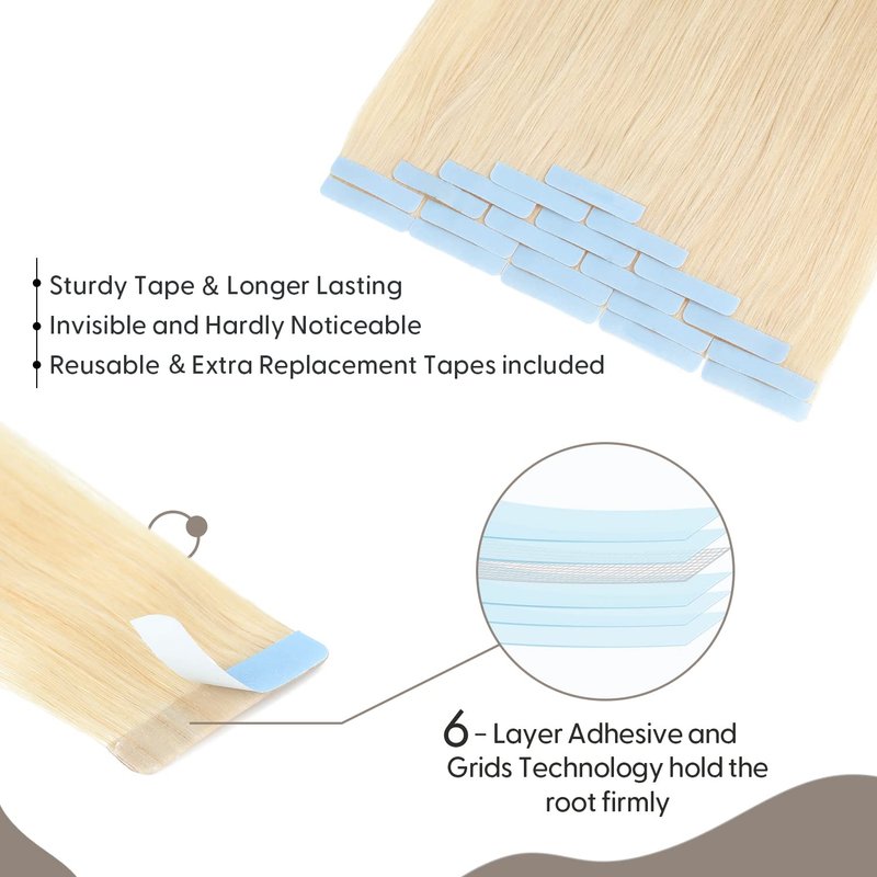 - 【Installation &Care Instructions】To Ensure Great Performance of Tape in Hair Extensions, Wash your hair and dry completely before install Tape ins. Do not wash your hair within 48hrs after install Tape in Extensions. Clamp the tape by straightener to make further Hold. Hair Extensions will Stay Soft with proper care. The tape adhesive is Super Tacky, so no worrying about potentially slipping out, and also it’s Easy to remove and Reusable. Normally you should replace the tape every 4-6 weeks.