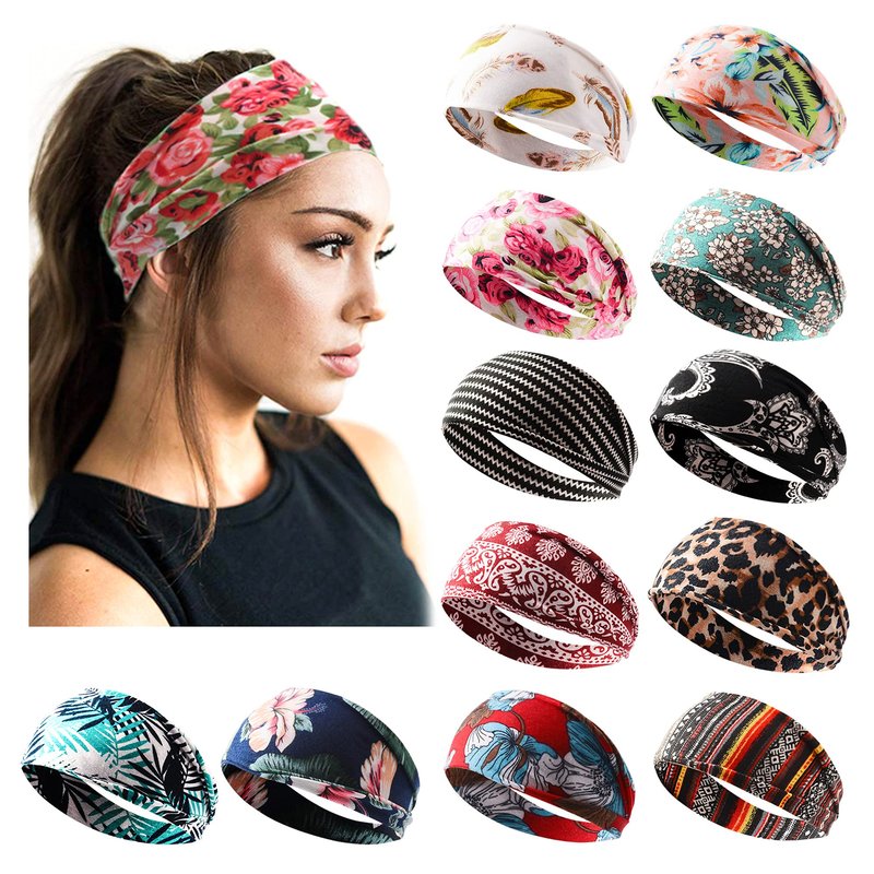 Jesries 12 Pack Headbands for Women Boho Printed Non Slip Hair Band Sport Yoga Running Elastic Sweat Hair Wrap for Girls