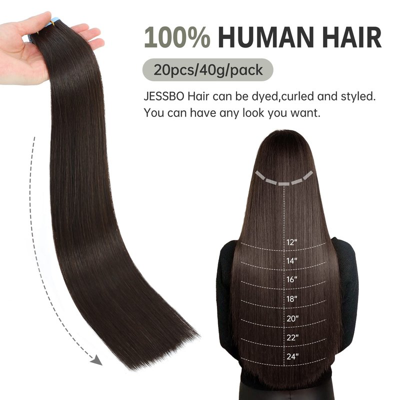 JESSBO Tape in Hair Extensions Human Hair Straight Dark Brown 100% Brazilian Human Hair 16 inch 20pcs 40g/pack Seamless Skin Weft Tape in Extensions for White Women (16 Inch #2 Dark Brown)