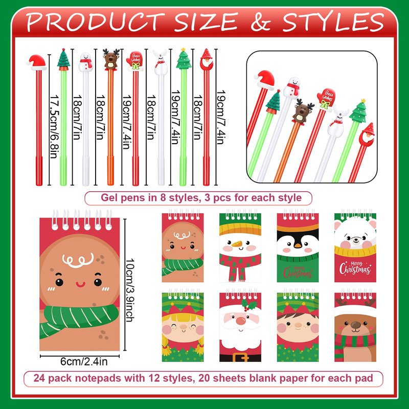 - Christmas Stationery Set: you will receive 24 pieces Christmas mini notepads and 24 pieces Christmas pens, both designed in 8 different styles, 3 pieces for each style; Such a complete stationery set is ideal to satisfy your various Christmas themed party favors