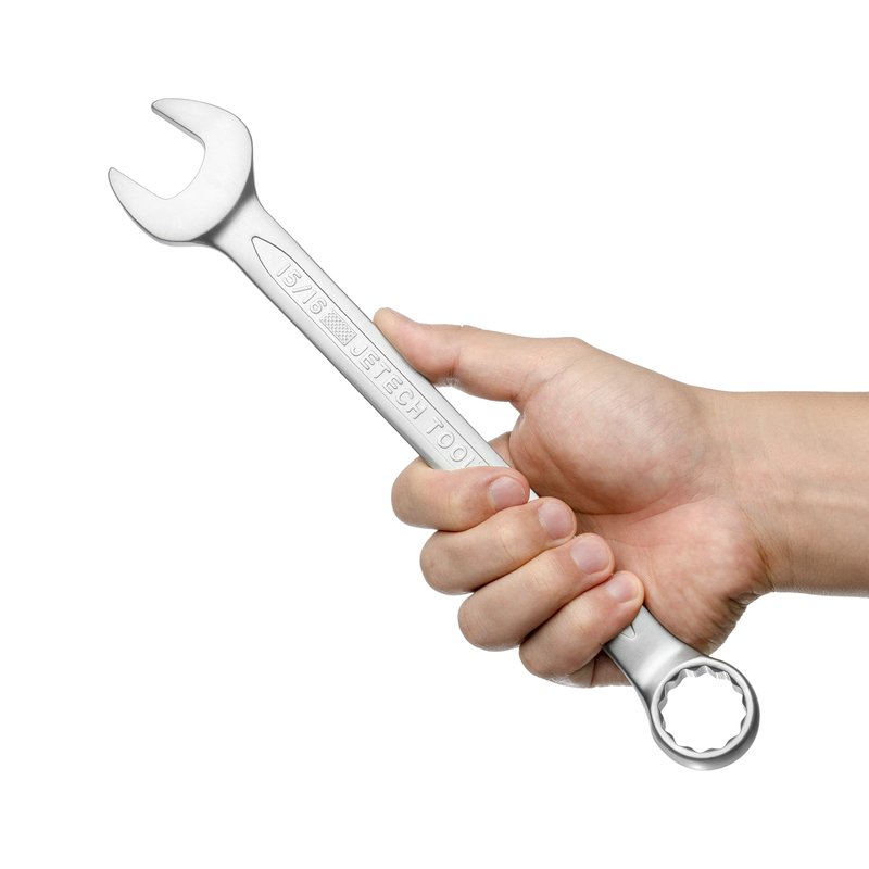 Founded in the 2000s, Jetech boasts a comprehensive range of tools with a strong focus on professional industrial-grade tools. We take pride in serving mechanics and users from over 60 countries and 5 continents. Jetech 15/16in combination wrench is made with forged, heat-treated and sandblasted chrome vanadium steel. Chrome plating provides rust and corrosion prevention. Designed to meet high industry standards, this wrench offers high strength and durability. The 12-point design on the box end ensures screws and nuts be gripped securely on the sides, thereby prevents the vertices from being rounded or stripped. Its 15-degree offset on the box end makes working in tight spaces possible. Choosing the right size of your wrench ensures the highest working efficiency and protects the screws and nuts.