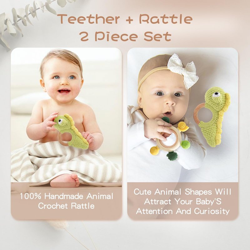 JETM·HH Teether Ring Wooden Baby Rattle Crochet Green Dinosaur Set | Infant Teething Toy | BPA Free Silicone Chewable Rings with Organic Featuring Multiple Textures | Crochet Rattle Baby