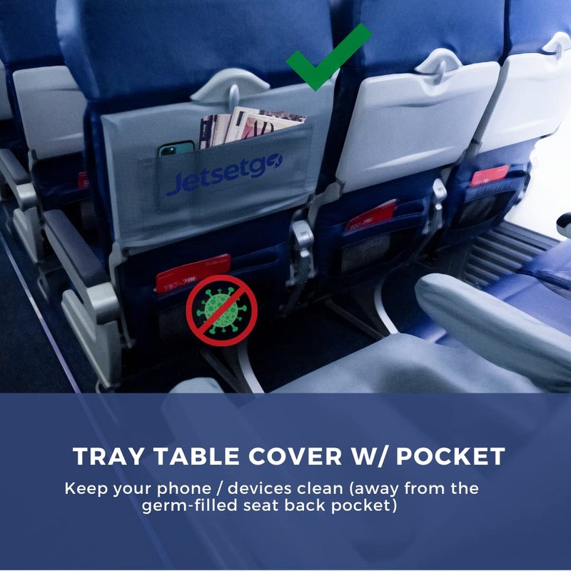 - POCKETED TRAY TABLE COVER - We all know the dirtiest part of flying is both the tray table and the seatback pocket that never gets cleaned. We are the only travel kit on the market with the patent-pending pocket built into the tray table cover to hold your phones, glasses, magazines to keep them away from dirty surfaces