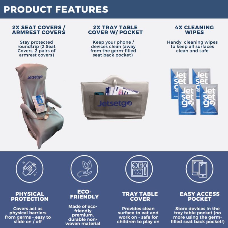 - OUR COMMITMENT TO YOUR HEALTH & SAFETY - Your health and safety is our number one priority. Our covers provide a physical barrier protecting you against dirty surfaces. Covering all high-touch surfaces while flying, you can rest assured our Jetsetgo covers will keep you safe