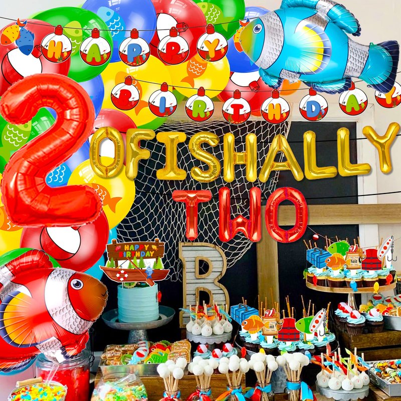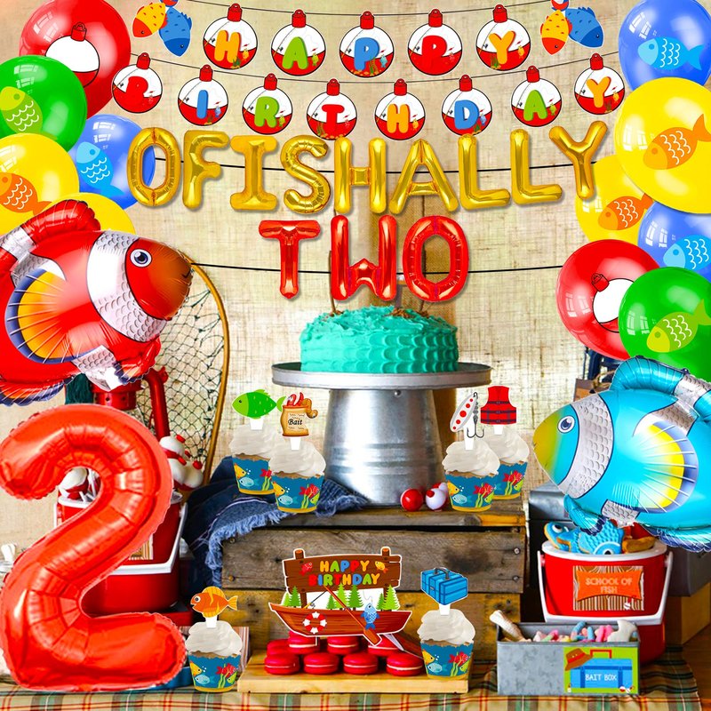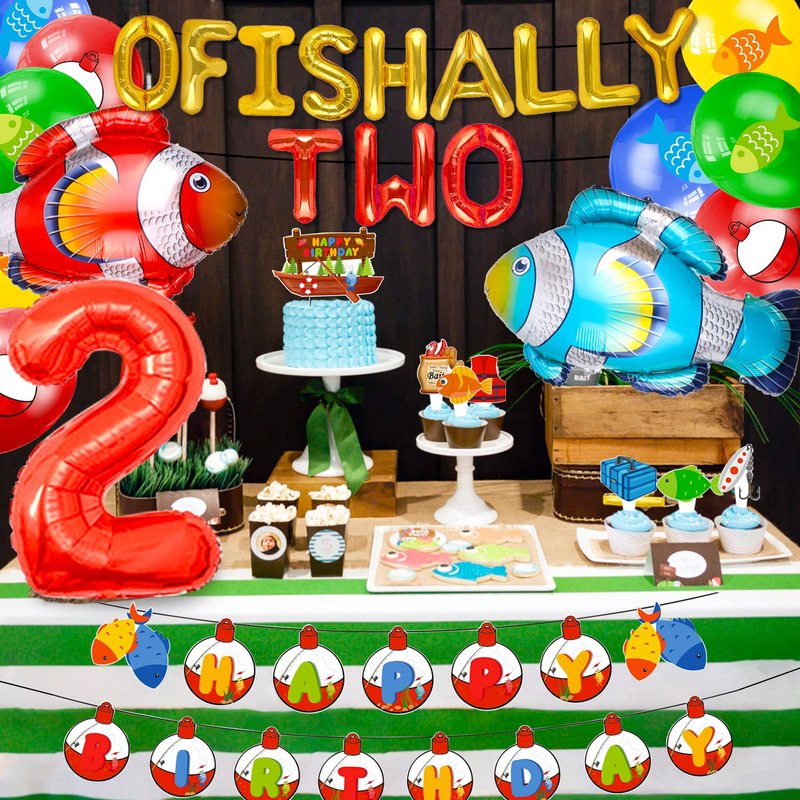 - What you will receive: 1 x Ofishally Two letter Balloons,1 x birthday banner, 16 x latex balloons, 1 x birthday cake topper, 12 x fishing cupcake picks. 2 x fish balloons.