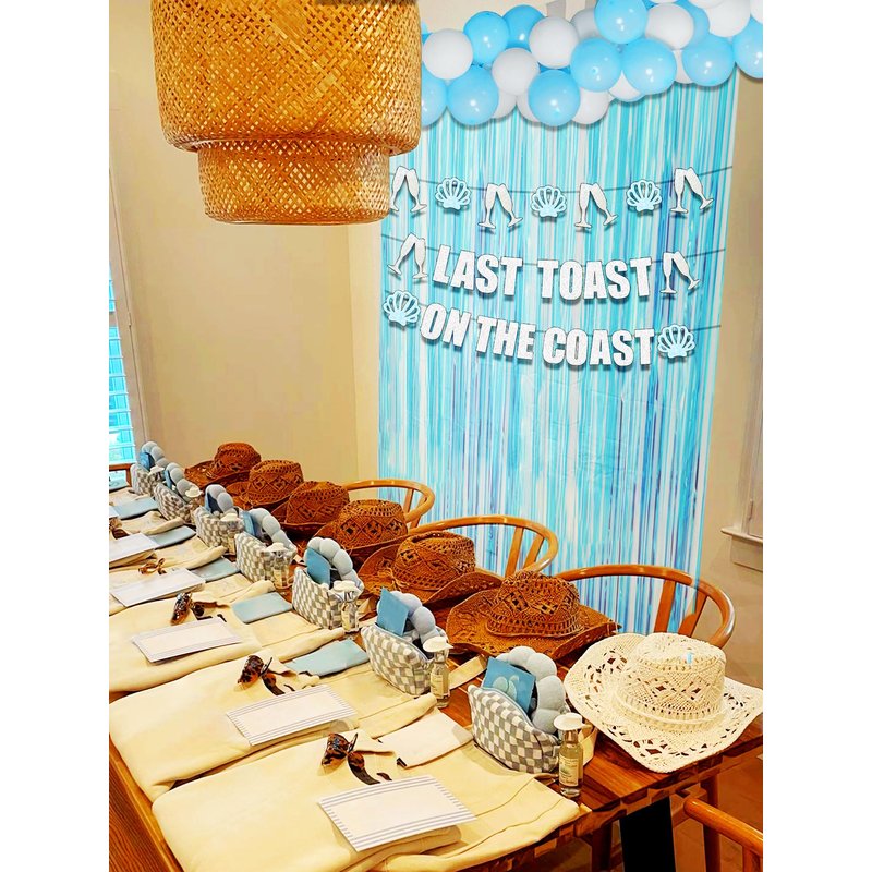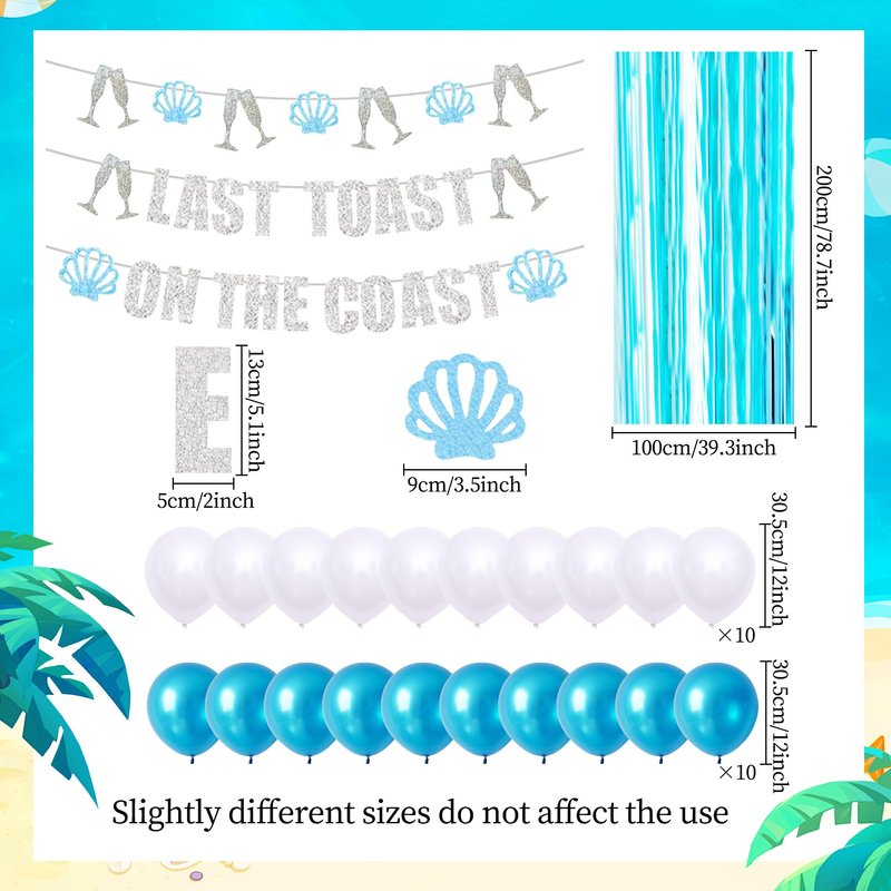 - What you will receive: 20 x balloons, 1 x Last Toast On The Coast banner, 1 x shells banner, 1 x blue curtain