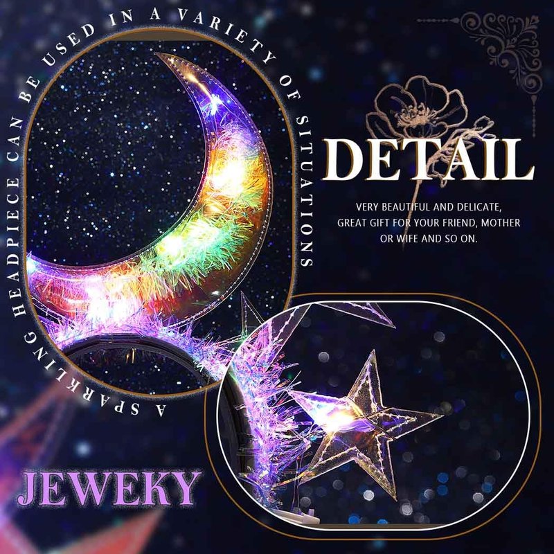 Moon headbands About us Jeweky is a boutique with a professional design team and production department. We also have a spirit of innovation. Jeweky specializes in all kinds of head wear, including hair pins, long strips, hair chains, combs, rave costume hair accessories, and various head wear accessories. About Star bling headpiecesGlow headpiece unique accessory design, dress up Halloween costume or makeup essential headband accessories.Display fun and exaggerated visual effects, adding to the fun of Halloween costumesStar hair accessories consist of moon, star and LED lights. The moon and star has a very realistic texture and bright colors to add dramatic effect to the festival costume. Design combines moon and star to create a rave party vibe.Laser light up headband can be paired with a Halloween costume or makeup to create a mysterious and unique look that will make you the center of attention at your Halloween party. Led hair hoop is also a popular gift nowadays, can be used for Halloween party, Halloween Eve, costume party, birthday party, theme party, Halloween theme cosplay, photography and many other occasions.