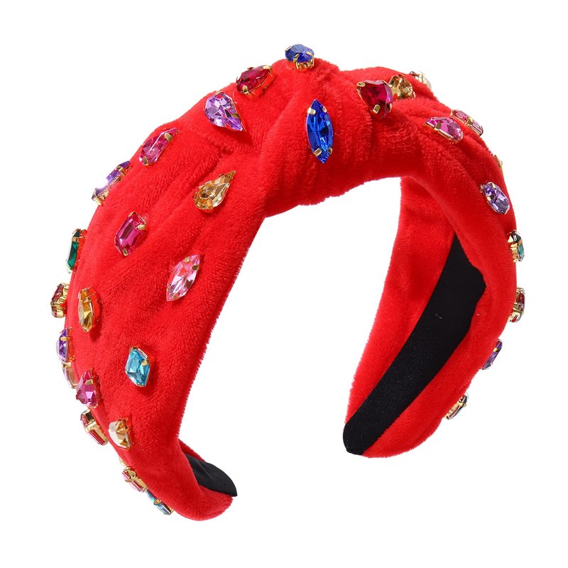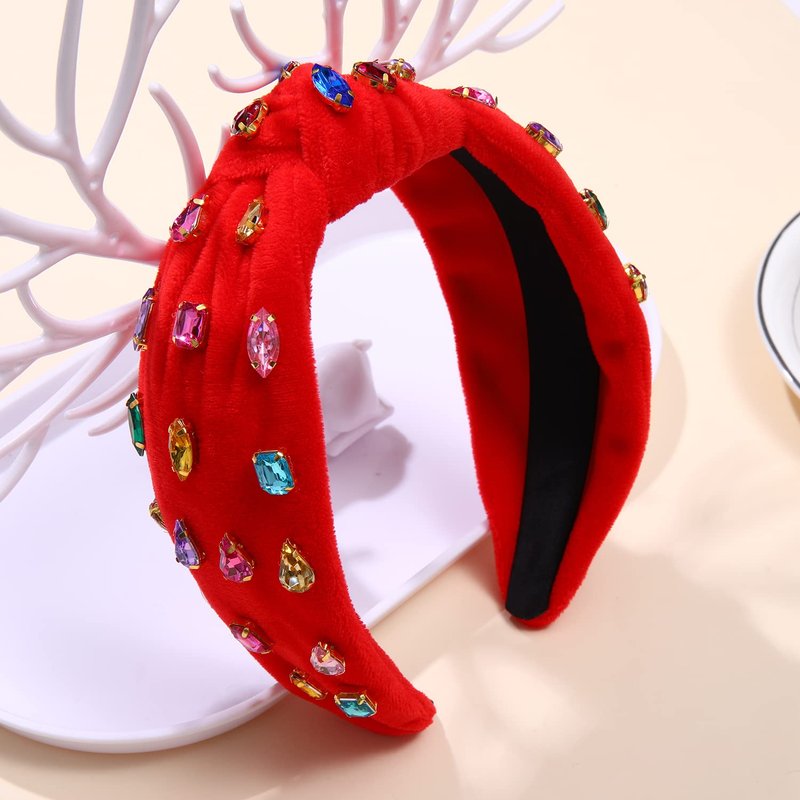 Jeweled Knotted Headband for Women Crystal Embellished Soft Flannel Hairband Women's Fashion Headbands Hair Accessories (Red)