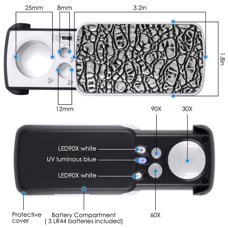 - 3 THREE MAGNIFICATIONS: 30X (25mm), 60X (12mm), 90X (8mm). The magnification is changeable according to the distance between the reading material and the magnifying glass, and the user can freely adjust the limit.