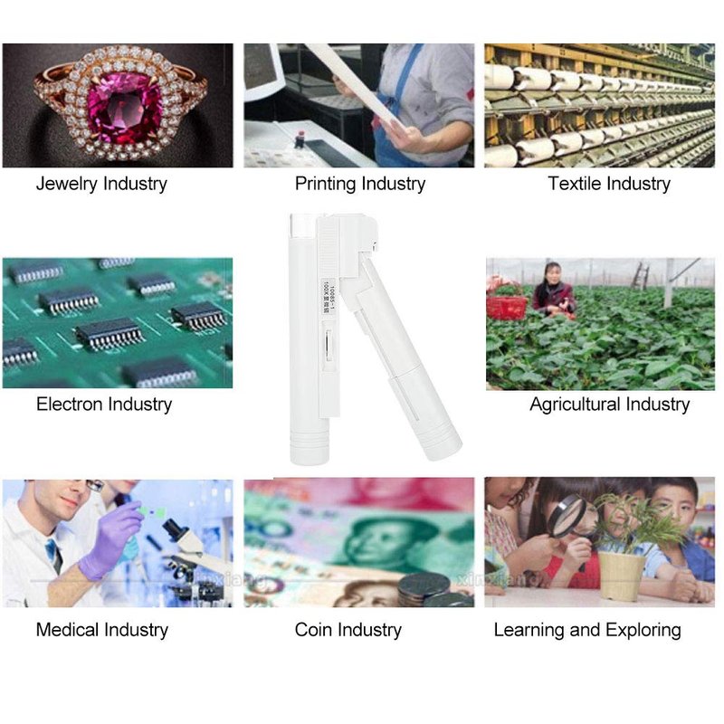 100x zoom LED microscope magnifying glass, enlarge the object to 100 times its original size. Suitable for jewelry and currency applications. It magnify the items nicely, which is great for examining the details. Mini size and lightweight, easy and convenient to use.
