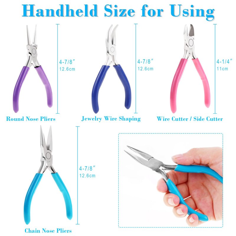 - 【Colorful Rubber Handle for Easy Identification】The wire jewelry making tools contains 4 pairs jewelry pliers set with non-slip handles, chain nose pliers with light blue color handle, round nose pliers with purple handles, side cutters with pink handles and bent nose pliers with blue handle