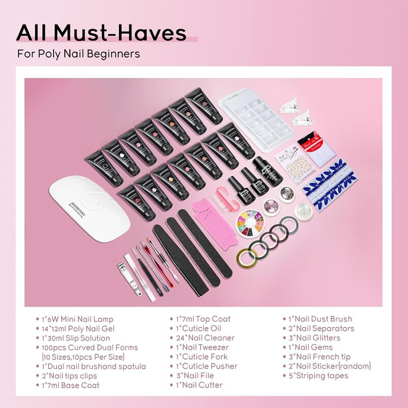 - JEWHITENY Poly Gel Nail Kit: 14 colors poly nail extension gel kit included 14*12ml poly nail gel, 6W mini nail lamp,Nail water and some other nail tools.Provide convenience for you to do nail salon anytime, anywhere.