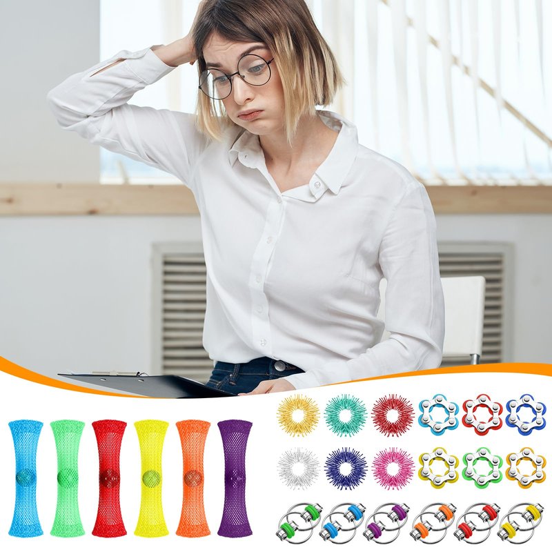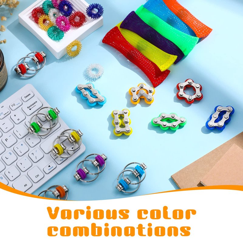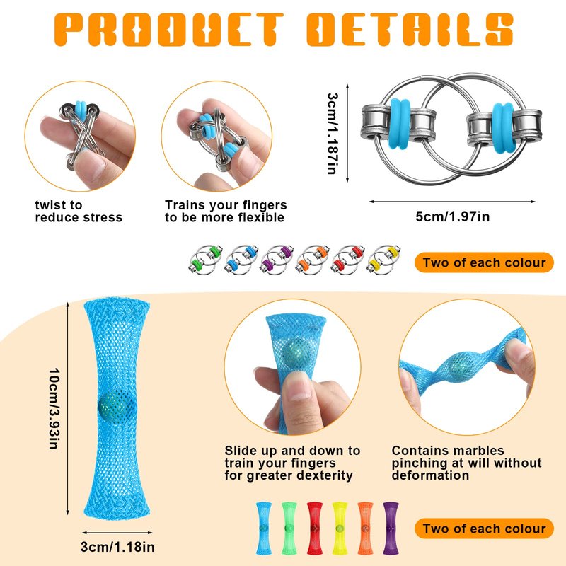 Features: This kit of anxiety relief toys includes roller chain toys, sensory rings and marble meshs, different styles can meet your needs and bring a lot of fun to your leisure time. Fidget toys for anxiety are suitable for most students, office workers, Autistic, ADHD and other people who need to decompress. Specifications: Material: stainless steel, rubber, high density nylon, anodized coating Color: as picture shown Package includes: 12 x Roller chain fingertip toys 12 X 6 Wheeled roller chains 12 x Sensory finger rings 12 x Fidget marble mesh Notes: Manual measurement, please allow slight errors on size. The color may exist a slight difference due to different screen displays.