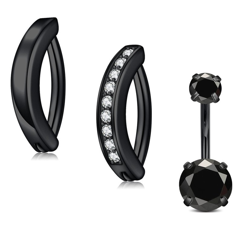 - Item Contain: 3 Pcs Black Belly Button Rings: 1X Glossy Surface Clicker Belly Ring, 1X CZ Inlaid Clicker Belly Hoop and 1X CZ Clawed Belly Button Ring.