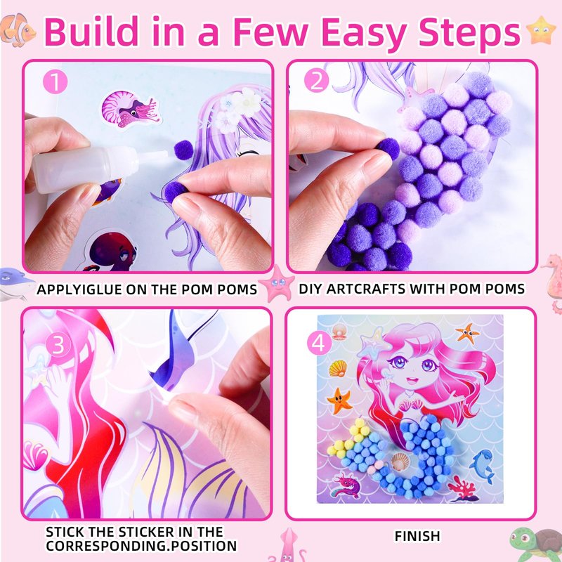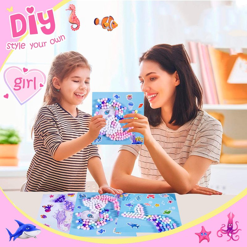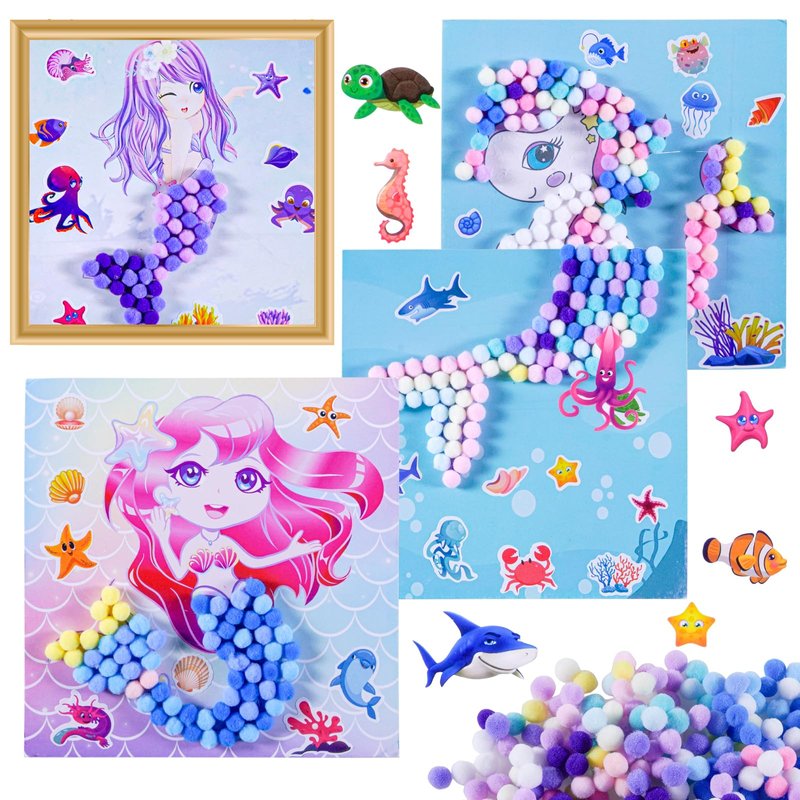 - Packaging Includes:Our pom pom painting set kit includes 4 sheets mermaid paper cards, 6 packs of colorful pom pom,8 sheets ocean themed stickers and 5 bottles of glue and 1 plastic tweezer.Dreamy and vivid mermaid motifs inspire creativity and make the art experience fun and engaging