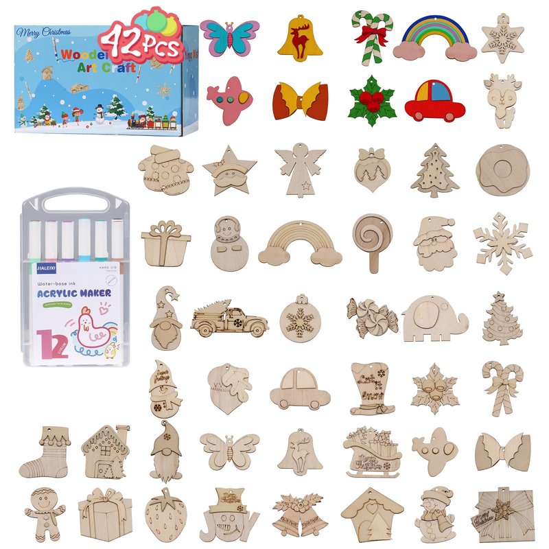 - Package: Includes 42 wooden Christmas crafts, 12 colored pens, magnet stickers.