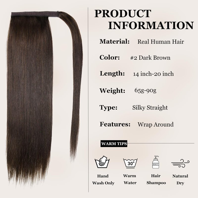 JIAMEISI Ponytail Extension Human Hair Wrap Around Clip in Hair Piece Ponytail Extension Human Hair Straight Ponytail Hair Extensions with Magic Paste 65G 14 Inch #2 Darkest Brown
