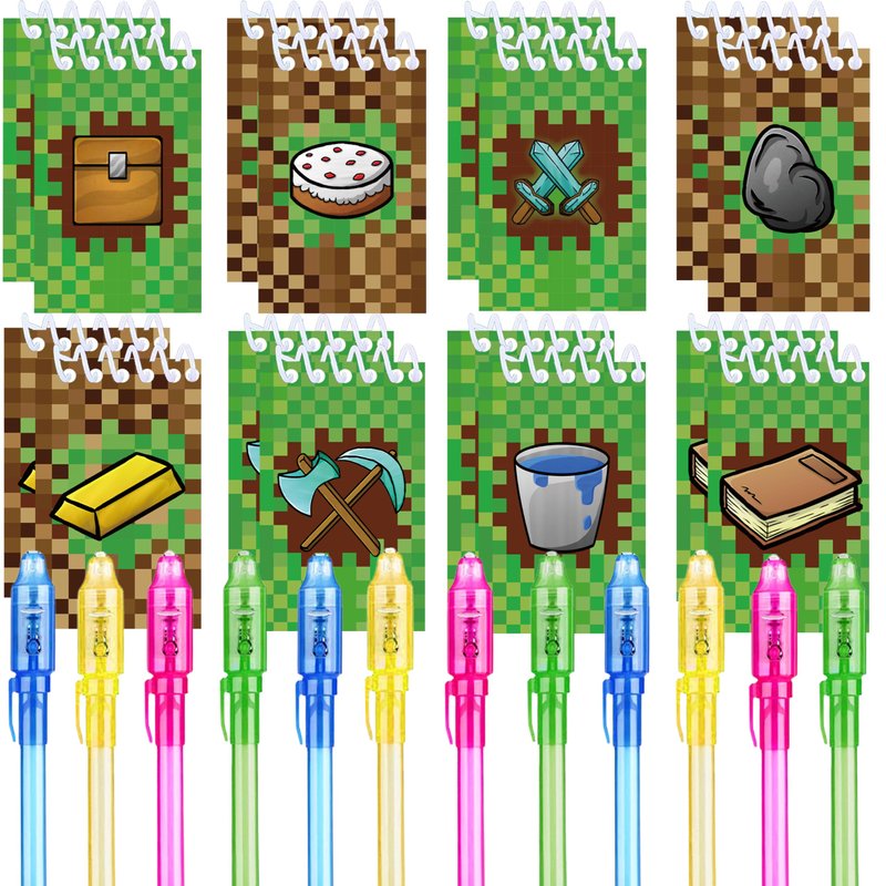 - Package includes 12 invisible ink pen with uv light + 12 Pixel Theme mini notepads (2.26-inch x 3.9 inch)
