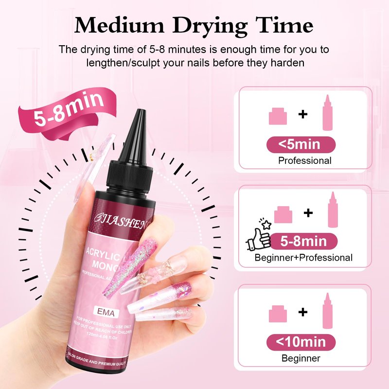 - Long-Lasting Durability - This upgraded version of acrylic monomer features enhanced flowability and higher purity,ensuring it remains free from yellowing even after extended use.Acrylic nail liquid is used in acrylic powder, which has quick-drying properties,making the nail art process more efficient and saving time.The upgraded formula of liquid monomeralso makes nails more shiny and natural, and the durability and durability are significantly improved, suitable for all nail types.