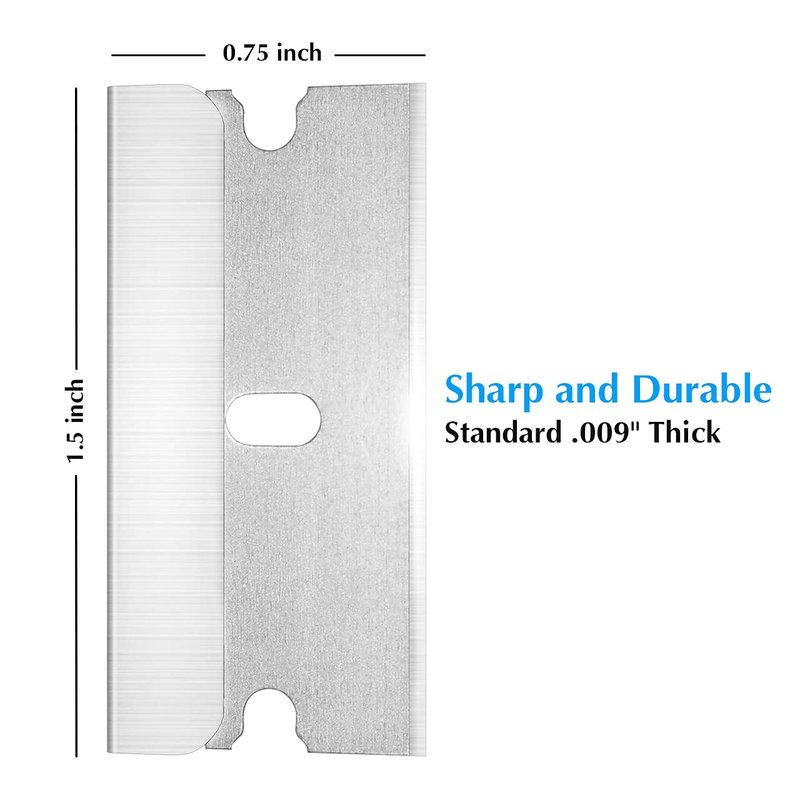 - Standard single edge razor blade, 1.5” length, 0.75” width, 0.009” thickness, 100pcs blades per box, package includes 2 boxes, total 200pcs blades, fits all standard safety scrapers, razor blades, you can also use for easy cutting jobs.