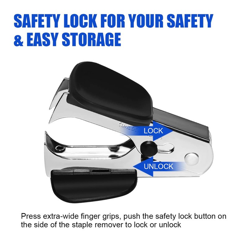Press extra-wide finger grips, push the safety lock button on the side of the staple remover to lock or unlock.(Safety lock for user's safety and easy storage)