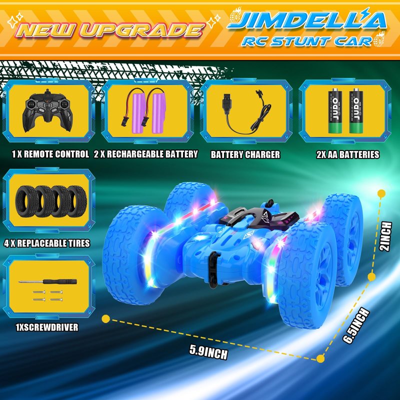 - [JIMDELLA REMOTE CONTROL STUNT CAR]-360 Flips Rotating Stunt RC Cars supports a variety of stunts. You can use the controller to control the car forward, backward, left turn, right turn, 360-degree rollover and rotation, bringing you unlimited fun. Both sides of RC Cars are equipped with cool colored headlights and color light strip, which can be turned on and off freely through the remote control.