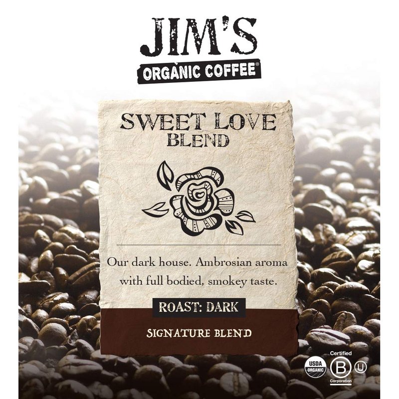 Jim’s Organic Coffee – Sweet Love Blend – Whole Bean, Dark Roast, Bold 11 oz Bag