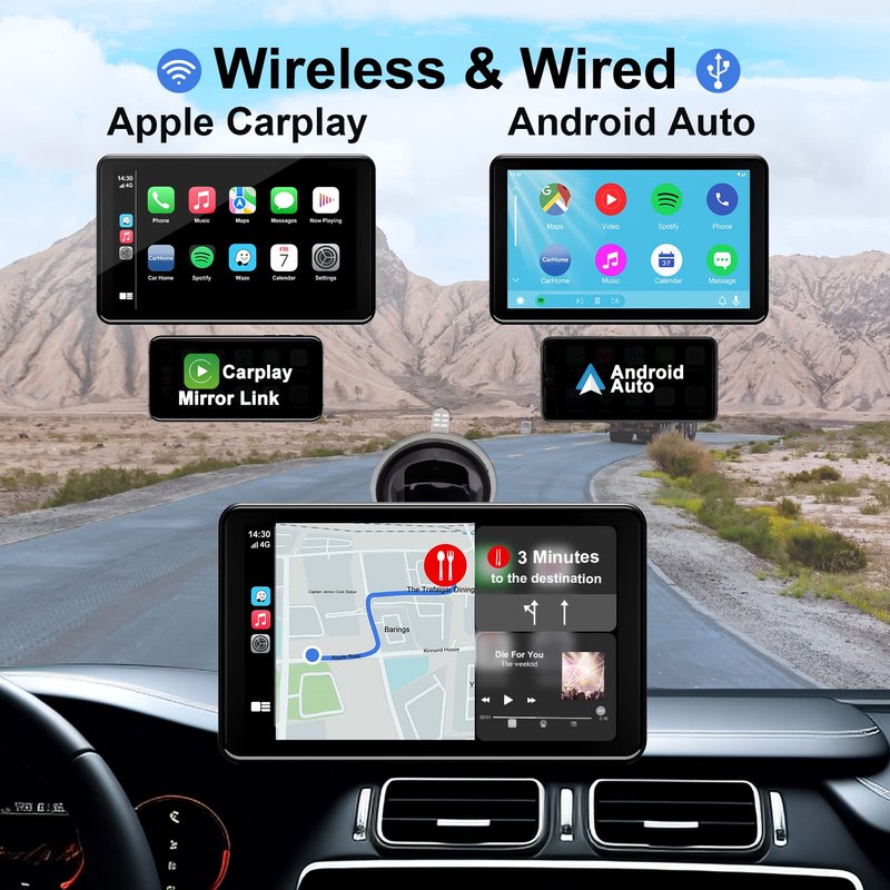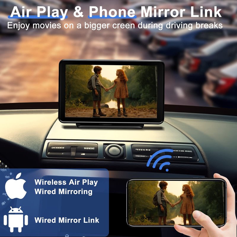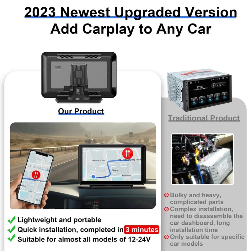 Wireless For Apple Carplay/ Android Auto: This car stereo with wireless Apple Carplay/Android Auto/Mirror Link is an excellent upgrade for any older vehicle. Simply pair it with your smartphone via Bluetooth and you're ready to go! No more charging cables needed, with touch screen car stereo, you can handle navigation, messages, phone calls, music streaming and other tasks wirelessly. Car Stereo With Bluetooth 5.0: This bluetooth car stereo with apple carplay has a Bluetooth 5.0 chip for more reliable wireless connectivity and pairing. The built-in microphone and hands-free function allow you to make smoother phone calls, listen to music, get text notifications, and even control with your voice via your device's Google or Siri assistant. So you can concentrate on the road and drive more safely and conveniently. AUX/ FM Connection: Our car stereo carplay screen supports AUX cables to connect to your car's auxiliary audio input, as well as wireless FM turning to pair with car radio channels and transfer voice to the original car audio for louder voice. You can get road information, play music, and more. Just have fun while driving. 7 inch 1080P Full HD touch screen car play stereo also supports USB/TF card. Compatible with 99% Car: Our portable apple carplay is compatible with all cars or trucks from 12-24V. It precisely suits your car and is lighter and more portable than a typical car stereo. If you enjoy traveling, you can also pack it in your backpack and use it to add Apple CarPlay to any car when you rent one at your destination. This android auto car stereo is the ideal trip companion for navigation. Simple installation: It is simple to install and remove a car stereo receiver that is attached to the dashboard or windshield using a self-adhesive bracket and a suction cup bracket. Upgrade your car stereo in 10 minutes without disassembling your car or needing any installation expertise. Please feel free to contact us if you have any questions.