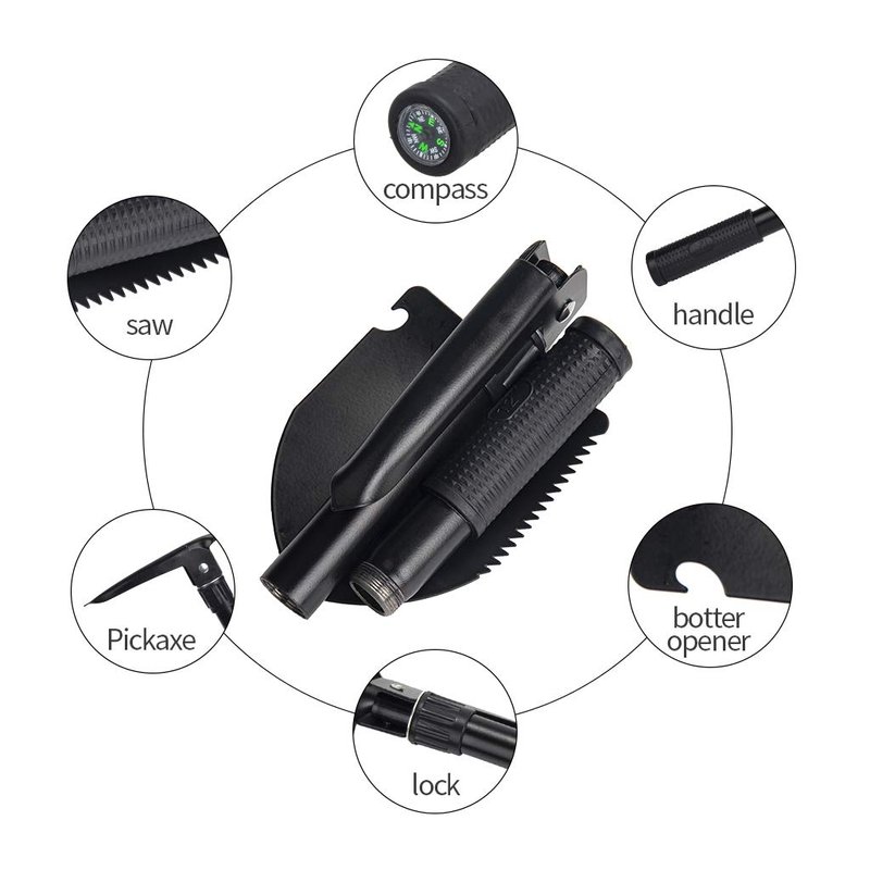 This multi-use shovel allows you to have all in one product pickaxe, shovel, compass and saw. The small compact size free you