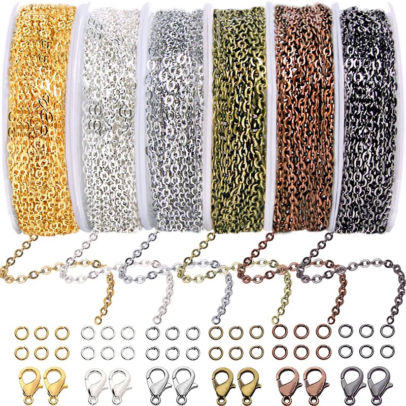 Jishi Chains Jewelry Making Supplies, 60ft Cable Link Chains for Making Jewelry Necklace Earring Bracelet Findings DIY Craft Kit for Adults, 6-Color 2mm Gold Silver Copper Plated Metal Link Rolls Bulk