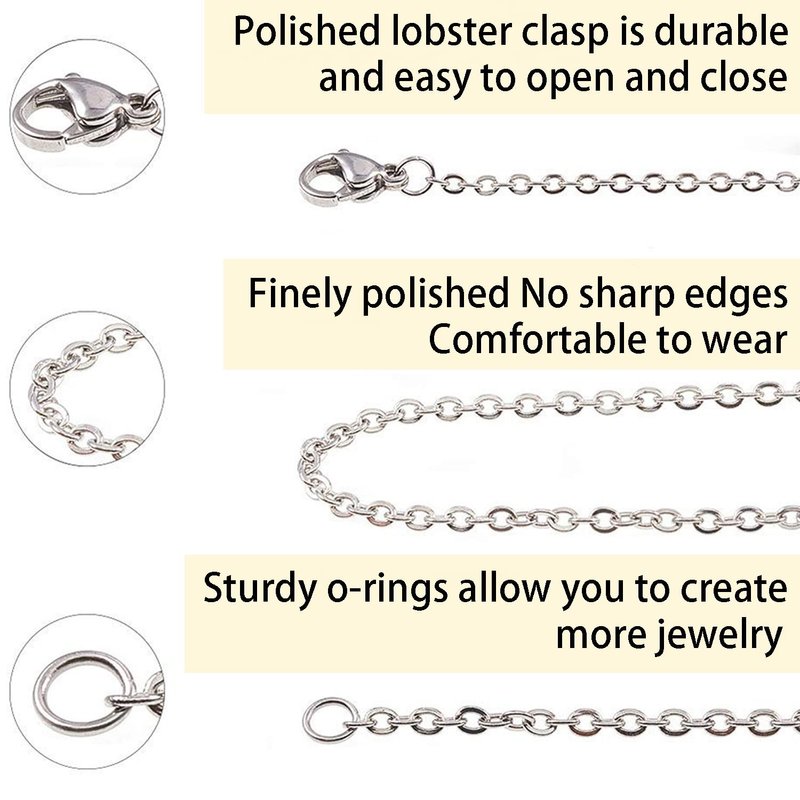 - THIN & STRONG: The size of the chain links are 2.5mm long, 2.0mm wide, 0.5mm thick; the lobster clasps are 10.0mm long, 5.0mm wide; the jump rings are 4.0mm long, 4.0mm wide - Small, fine, but strong and sturdy. Great for jewelry findings and supplies.