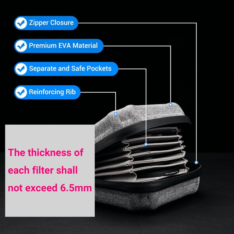 - 【HIGH CAPACITY】:*****The thickness of each filter shall not exceed 6.5mm******.The filter pouch holders 10 round filters up 95mm (49mm/52mm/55mm/58mm/62mm/67mm/72mm/77mm/82mm).