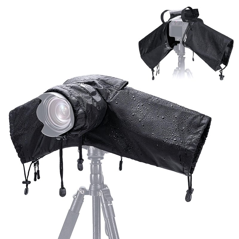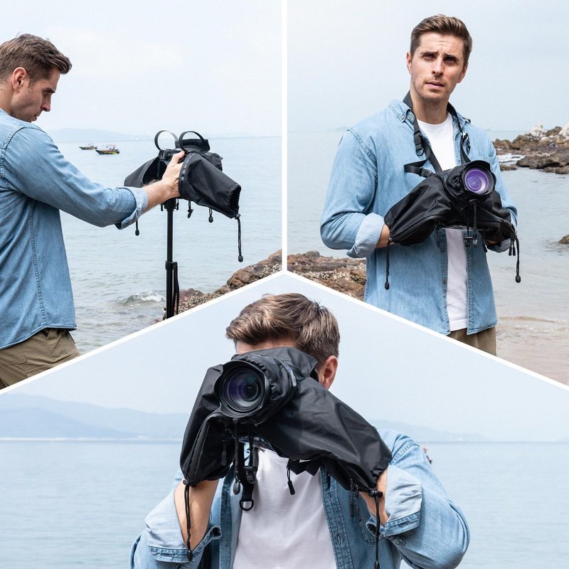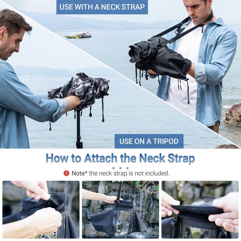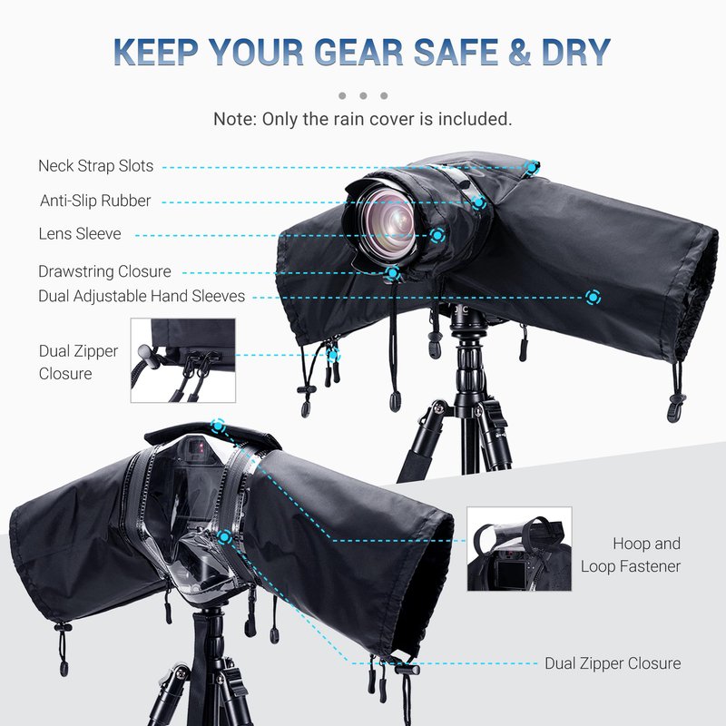 - 【Easy Access】Easy access all your camera functions through the two cinchable sleeves. A camera strap can be reached out through the rain cover opening on the top to facilitate handheld camera shooting.