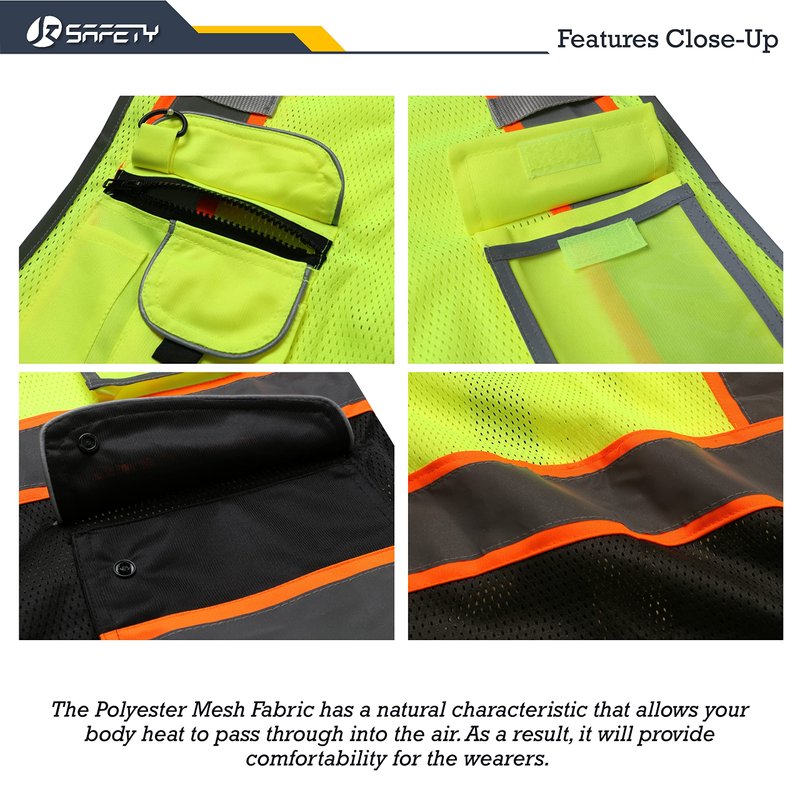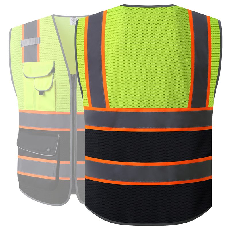 - HIGH VISIBILITY AND 360° REFLECTIVITY: Neon Yellow and Black dual body color safety vest is highly visible with Four 2-inches wide Orange color trims reflective strips covering the chest, the waist, and the back, she can reflect 360 degrees Retro-Reflective light wave under daylight or low light conditions.