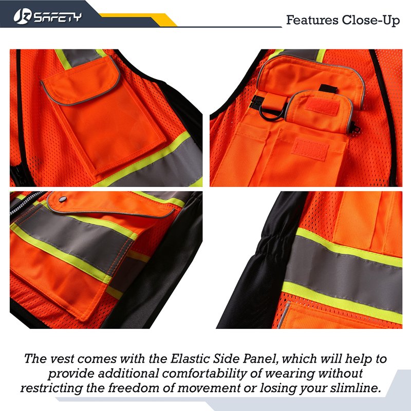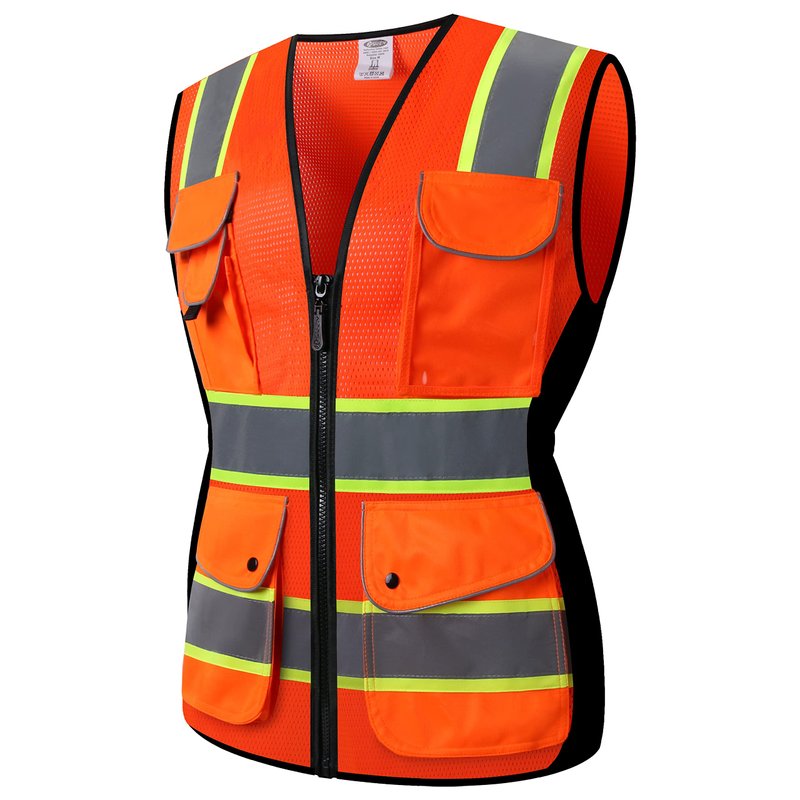 - SAFETY WITH A TOUCH OF STYLE: JKSafety 9 Pockets Hi-Vis Reflective Safety Vest especially designed for our female colleagues. The 100% Polyester American Mesh Fabric dyed fluorescent color. Two elastic side panels not only can provide a streamlined cutting effect along the waistline but also maximize your mobility without losing your body shape. In addition, the vests are breathable, lightweight, and machine washable.
