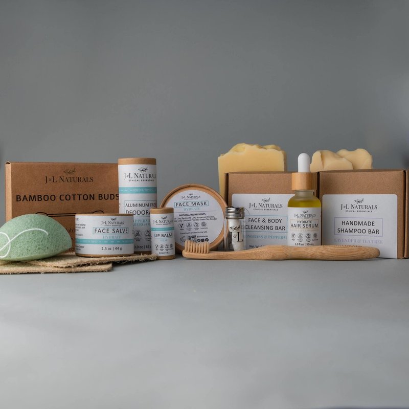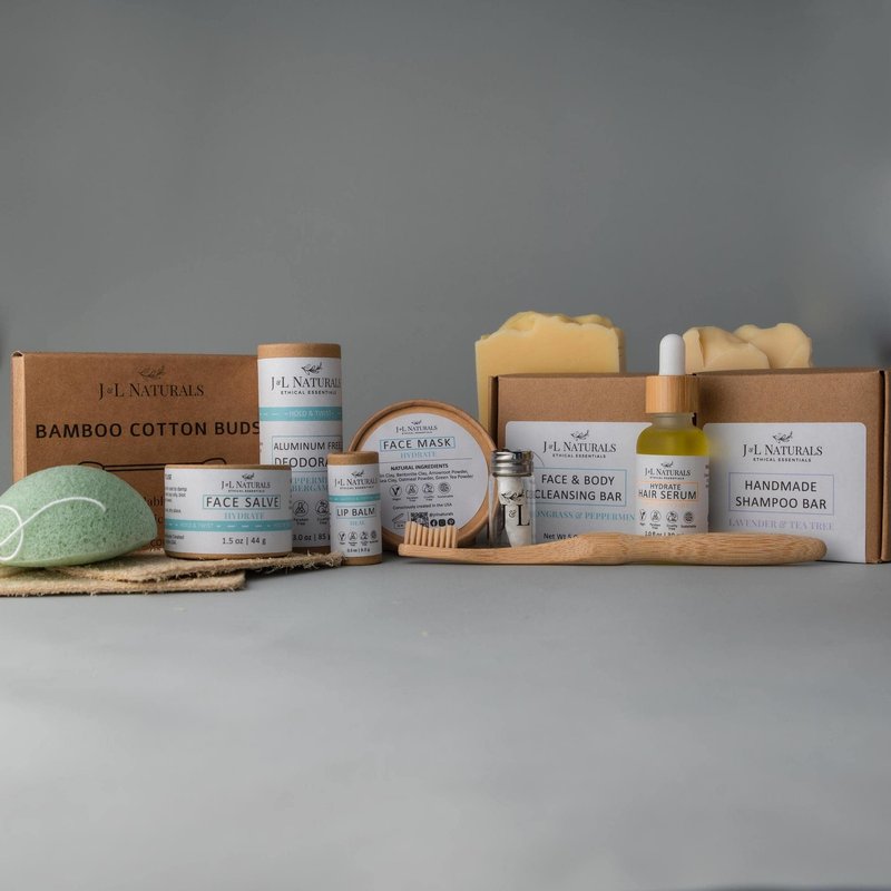 Each kit includes: (1) 5oz. Cleansing Bar, (1) Konjac Sponge, (1) 1.5oz. Face Salve, (1) 0.3 oz. Lip Balm, (1) 5oz. Shampoo Bar, (1) 1oz. Hair Serum, (1) 1oz. Aluminum-Free Deodorant, (1) Bamboo Toothbrush, (1) Floss Kit, (1) Loofah Pad, (1) Box of Cotton Buds.