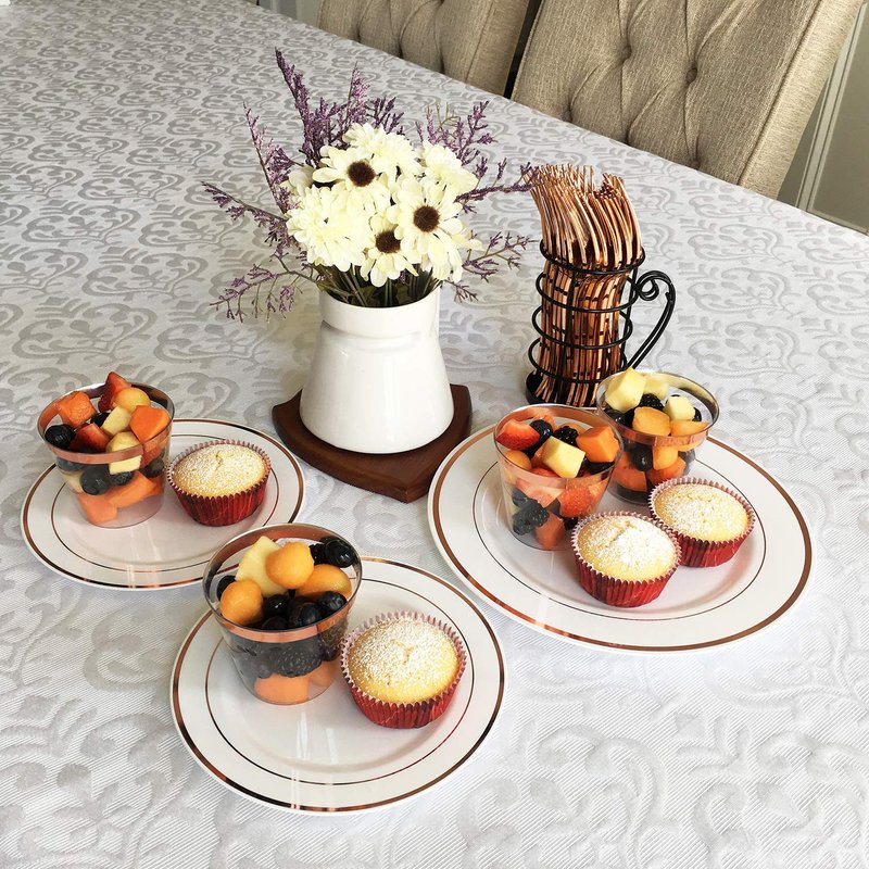 FULL SIZED ROSE GOLD PLASCIC CUTLERY comes with 8-inch knives, 7-inch forks and 7-inch spoons. No flimsy flatware here. These have realistic weight and can hold food just like real metal silverware.