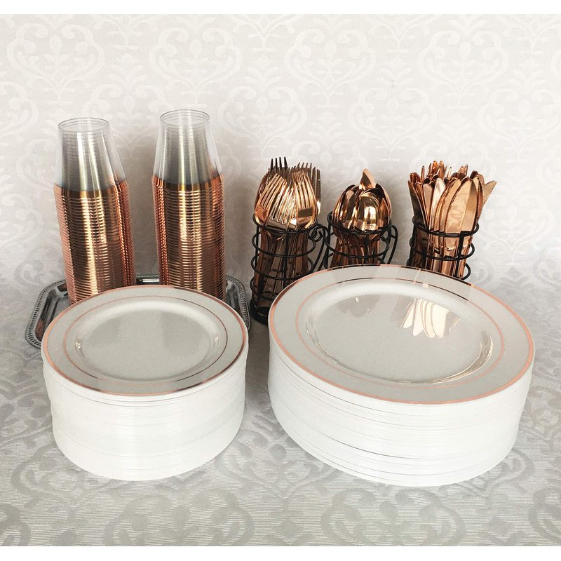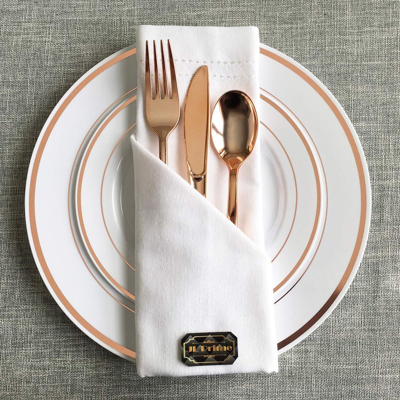 - DELUXE ROSE GOLD PLASTIC SILVERWARE shiny metallic look makes guests think you brought out your fine silverware for the occasion. This remarkably realistic cutlery collection always impresses your guests at special events, such as wedding, anniversary, rehearsal, shower and many more.