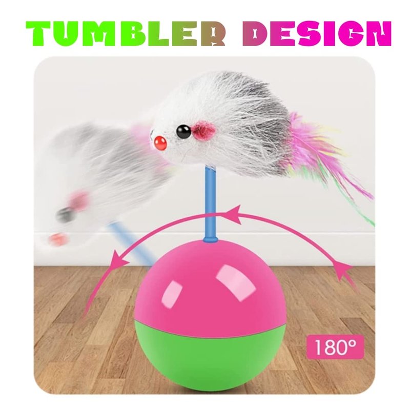 - Design: Tumbler design gives your cat good feedback to play longer. Contains sound-making particles to attract your cat's attention. Fluffy and coloerful feather never goes out of style