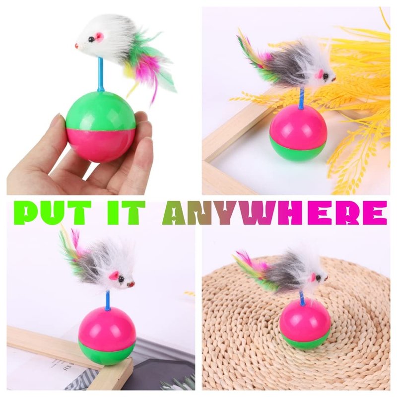 Material: Mouse toy made by flocking, soft and sturdy. Stretching/tearing resistant toy with feather uses a variety of bright colors that will attract cat's attention. Ball made of ABS, non-toxic, safe for your cats Size: 5.5 x 11 cm / 2.2 x 4.3 inch. Suitable for all places Design: Tumbler design gives your cat good feedback to play longer. Contains sound-making particles to attract your cat's attention. Fluffy and coloerful feather never goes out of style Useful for: Make your cat occupied, saving your sofas, armchairs, tablecloths and sheets. Help improve its mood, also good for weight loss Place it anywhere: Not too large, not too small. Can be placed anywhere while won't take you much time finding it. Help your cat adapt to new environments