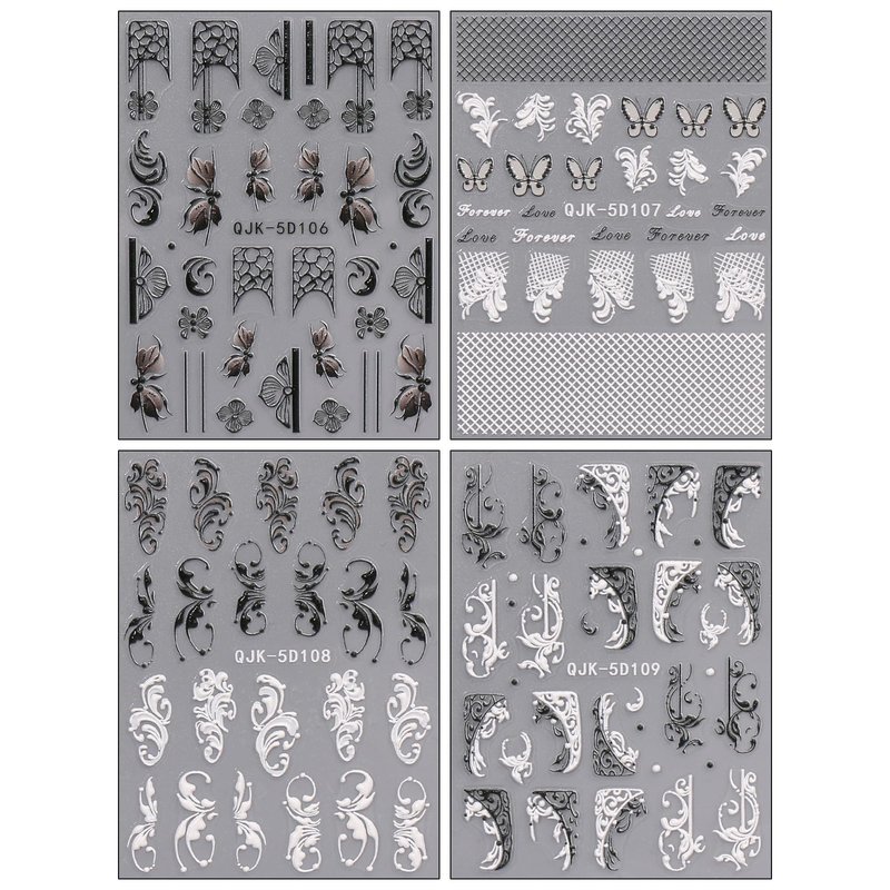 JMEOWIO 3D Embossed Black White Flower Nail Art Stickers Decals Self-Adhesive Pegatinas Uñas 5D Line Leaves Nail Supplies Nail Art Design Decoration Accessories 4 Sheets