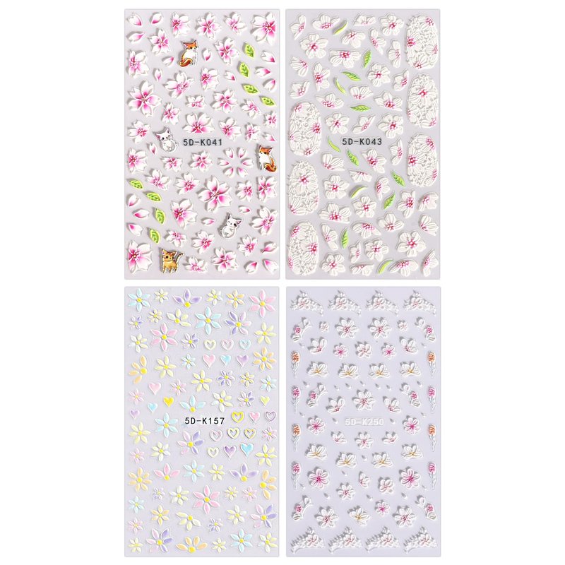 JMEOWIO 3D Embossed Flower Nail Art Stickers Decals Self-Adhesive Pegatinas Uñas 5D Summer Spring Floral Nail Supplies Nail Art Design Decoration Accessories 4 Sheets