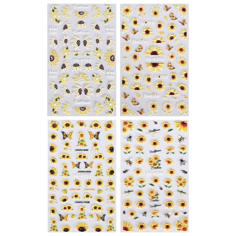 JMEOWIO 3D Embossed Flower Sunflower Nail Art Stickers Decals Self-Adhesive Pegatinas Uñas 5D Floral Daisy Nail Supplies Nail Art Design Spring Summer Decoration Accessories 4 Sheets