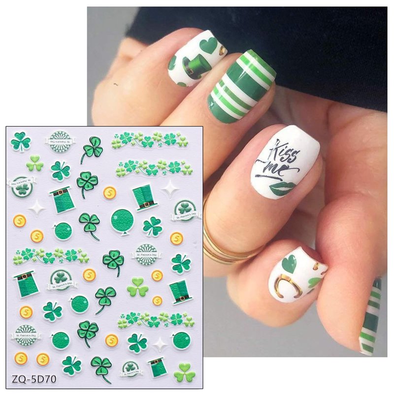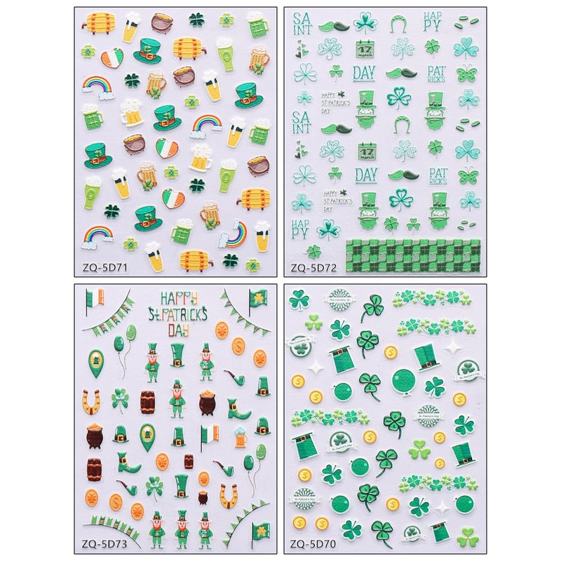 JMEOWIO 3D Embossed St Patricks Day Nail Art Stickers Decals Self-Adhesive Pegatinas Uñas 5D Green Clover Gold Hat Nail Supplies Nail Art Design Decoration Accessories 4 Sheets